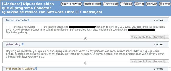 Opera Gmail introdujo y Gmail popularizó (corríjanme si me equivoco) la vista de los correos en forma de conversaciones, una manera muy sencilla de seguir el hilo de nuestras respuestas. Thunderbird trae por defecto la visualización como conversación, pero existe una extensión que mejora un poco este tipo de visión y agrega los botones para responder/reenviar/borrar el correo. El addon se llama Gmail Conversation View y se encuentra en su segunda beta (yo la uso desde la alpha y nunca tuve problemas).