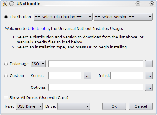 Unetbootin (Universal Netboot Installer) es una excelente aplicación multiplataforma que permite la creación de USBs booteables de varias distribuciones GNU/Linux y packs de herramientas, sin tener que contar con CDs o DVDs grabables.