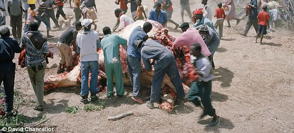 La respuesta dependerá de muchos factores, pero en un pueblo de Zimbabue se terminaron en tan solo 1 hora con 47 minutos, según reportan desde People Daily. No es un tema tecnológico, y quizá tampoco del todo Geek, pero vamos, que fotos como estas son impresionantes, y mas cuando nos ponemos a meditar que detrás de cada toma hay un humano que aprovecha el fin del ciclo de un animal de 70 años, para con sus restos alimentar a su hambrienta familia.