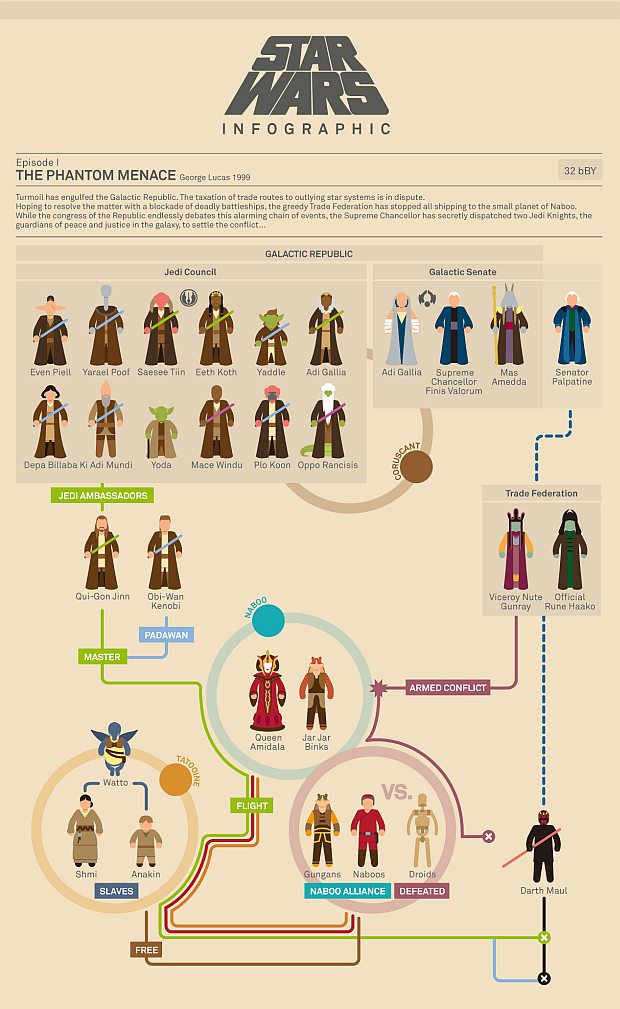 Si queremos darle un repaso al episodio de »La Amenaza Fantasma» de Star Wars, esta infografía nos ayuda vinculando todos los personajes para llegar a una conclusión, con la que se desarrolla el siguiente episodio. Es bastante extraño que alguien haga esto (o que lo lea)… hmmm… igual hay muchos geeks en el mundo, sobretodo algunos que aman Star Wars. Aquí está: