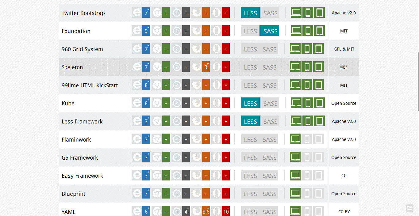 Por ello te presento hoy CSS Frontend Frameworks un sitio web creado por usabli.ca, un grupo de desarrolladores independientes que crean aplicaciones y productos con alta usabilidad, el sitio muestra la comparación de más de 30 frameworks diferentes, entre la información que utilizan para compararlos está la compatibilidad con las versiones de los navegadores más usados, Chrome, Firefox, Safari, Opera e Internet Explorera, el lenguaje dinámico que utilizan para su creación, si es Responsive, es decir, si está creado de tal forma que el sitio web que lo utilice se puede ver correctamente en móviles y tablets, la licencia bajo la cual es ofrecido y por último un pequeño texto descriptivo del Framework.