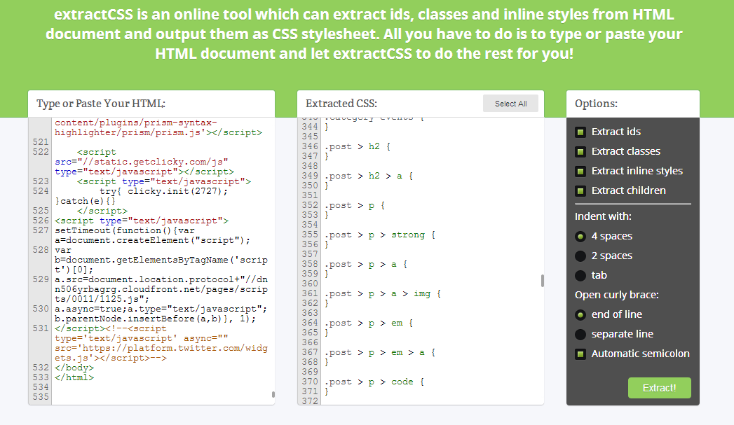 Posee algunas configuraciones, se puede seleccionar el tipo de información que se desea extraer del documento, el número de espacios de indentación y el estilo de las llaves de apertura en el CSS, cuando tengas todo listo solo debes copiar el HTML al que deseas extraer la estructura CSS y darle click al botón Extrac! verde, obtendrás al lado derecho la estructura de los estilos y si es el caso el estilo en línea de los elementos HTML que lo tengan.