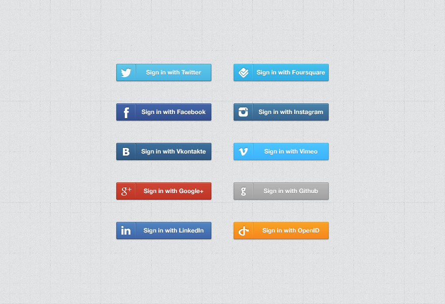 Social sign in buttons es un paquete de botones completamente gratuitos listos para ser usados en tu nueva aplicación web, vienen en formato PSD con los botones para iniciar sesión de la mayoría de las redes sociales y servicios.