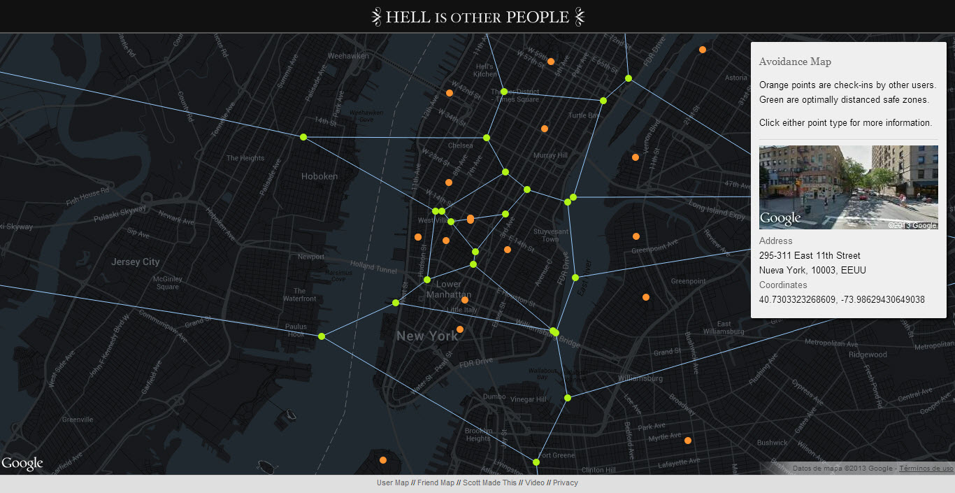 Por otro lado Foursquare puede ser útil para evadir a las personas que tienes agregadas en el, para ellos existe Hell is other People o en Español, La otra gente es un Infierno, donde luego de ingresar con tu cuenta de Foursquare, la página te muestra los lugares, rutas o caminos seguros que puedes tomar o ir para que no tengas encontrarte con esa persona que no quieres ver.