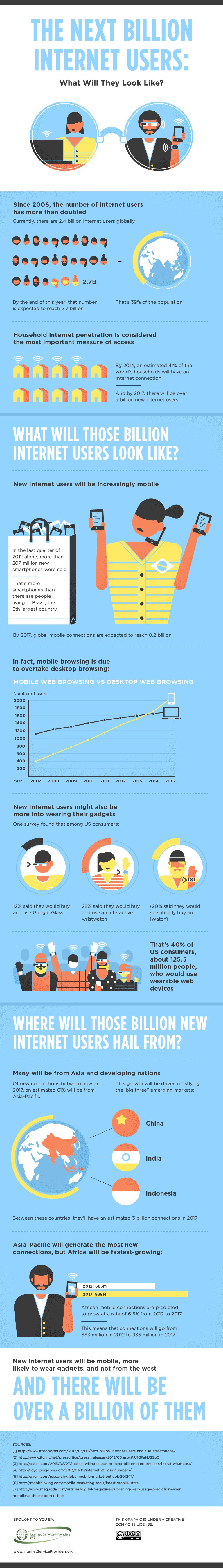 Para los nuevos usuarios será cada vez más común conectarse a Internet desde dispositivos tecnológicos que se puedan vestir, como las Google Glass o los relojes inteligentes que apenas están surgiendo, la mayoría de los usuarios vendrán de países Orientales como China, India e Indonesia, estos países generarán la mayor cantidad de tráfico pero África tendrá el mayor crecimiento de usuario, y es que el viejo continente es donde más se están implementando programas para llevar Internet a sus lejanos lugares.