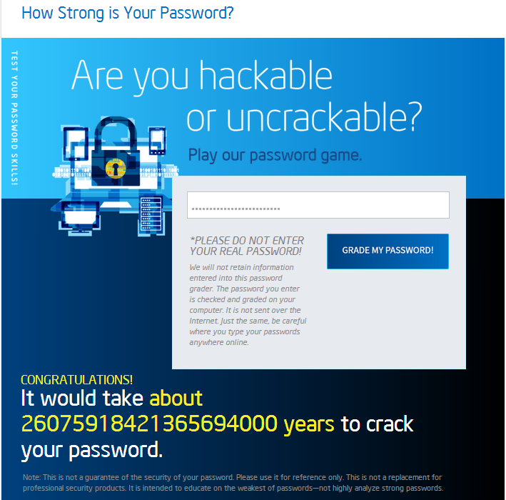 Si deseas medir que tan segura es tu contraseña actual o alguna que estés ideando Intel lanzó una analizar de contraseñas que te indica el tiempo que tardaría un cracker en descifrarla, el servicio se llama How Strong is Your Password, se te recomienda no introducir tu contraseña real sino variaciones, aunque el sistema funcione en el navegador siempre es importante recalcar la precaución de poner tus contraseñas en cualquier lugar.