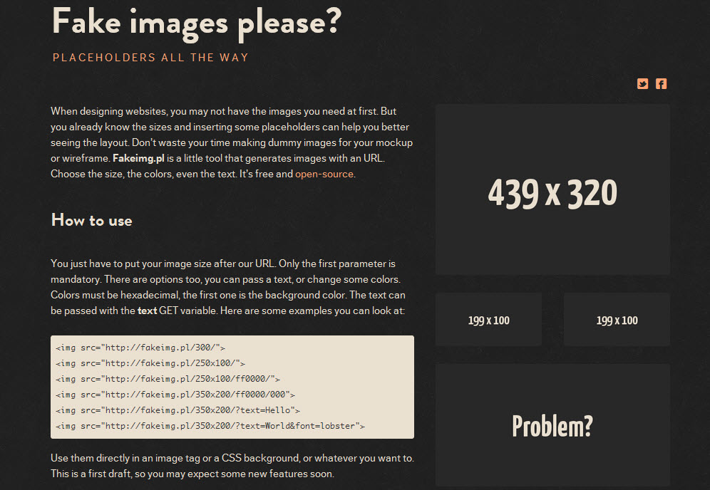 El último servicio que les presento es Fake images please?, al igual que los otros servicios permite insertar imágenes con un color personalizado de relleno, así como el texto y las dimensiones que necesites, como bonus es posible seleccionar la fuente con la que será mostrado el texto de la imagen.