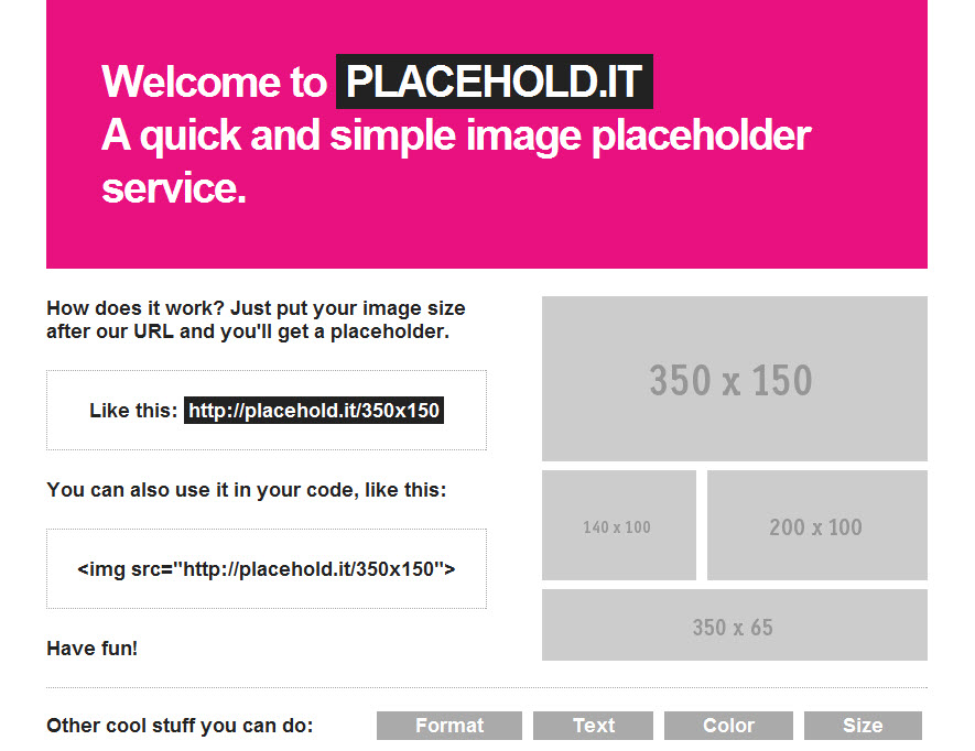 Otro servicio para insertar imágenes de relleno o imágenes placehold en Inglés es Placehold.it en el formato http://placehold.it/350x150, al igual que el otro servicio, también permite personalizar las dimensiones de las imágenes o el texto de la misma, pero tiene como bonus la posibilidad de seleccionar el formato de la imagen, entre .gif, .jpeg, .jpg y .png, por último se puede especificar el color de fondo de la imagen y el color del texto, si estás mostrando alguno.