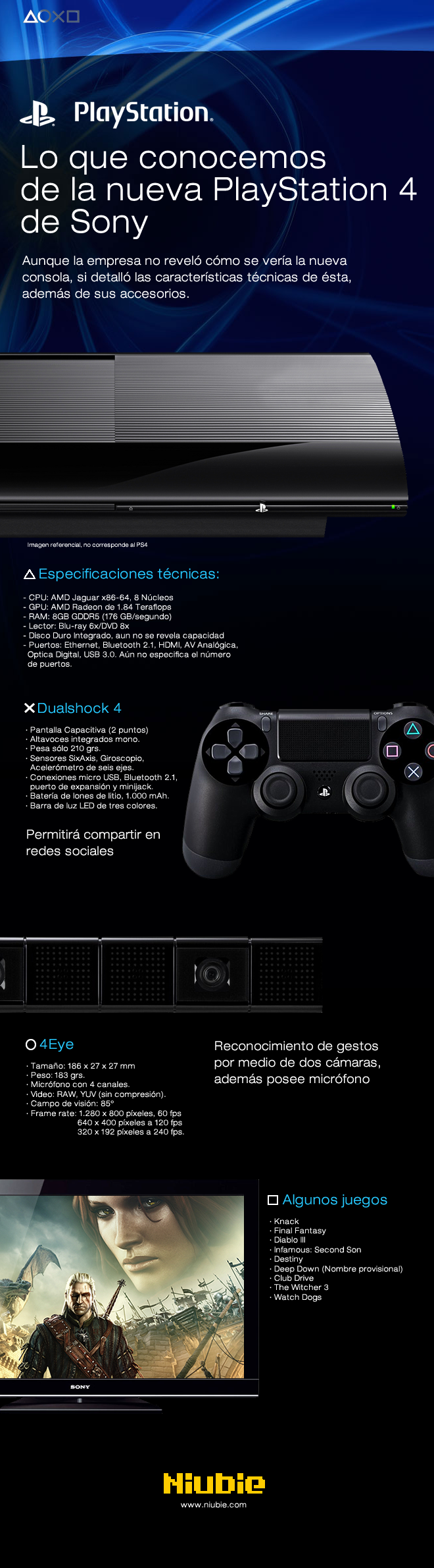 Algunos juegos que ya están creados para la nueva c0nsola son Final Fantasy, Diablo III, Destiny -el nuevo juego de Bungie, los creadores de Halo-, The Witcher 3 y Watch Dogs.