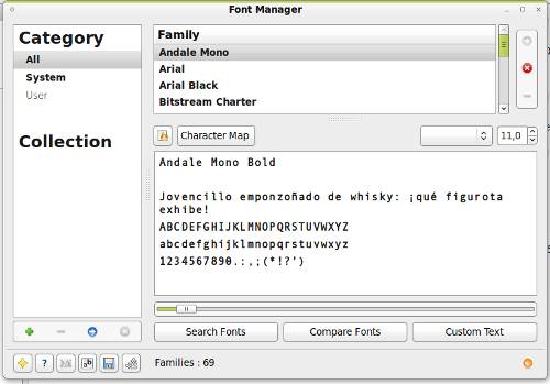 Con Font Manager, que actualmente se encuentra en su versión 0.5.6, es posible administrar y gestionar colecciones de tipografías. Además de las tipografías del sistema y el usuario. Esta aplicación, al iniciarse, detecta automáticamente todas las tipografías instaladas en nuestro sistema, y permite buscarlas por nombre o previsualizarlas con un texto personalizado.