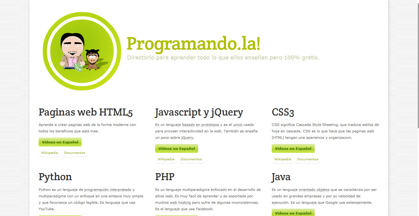 En los últimos años han surgido plataformas web con el único objetivo de enseñarte a programar en algún lenguaje, principalmente lenguajes web como HTML5, CSS3, Ruby o JavaScript, pero estas plataformas por desgracia o afortunadamente, están en Inglés, afortunadamente ya existe Programando.la, un sitio web que recopila más de 100 vídeos tutoriales completamente en español sobre diversos lenguajes como HTML5, JavaScript, CSS3, Python, PHP, Java, Ruby, Ruby on Rails y C++, el sitio además cuenta con un listado de documentos en inglés con tutoriales y especificaciones de los lenguajes.