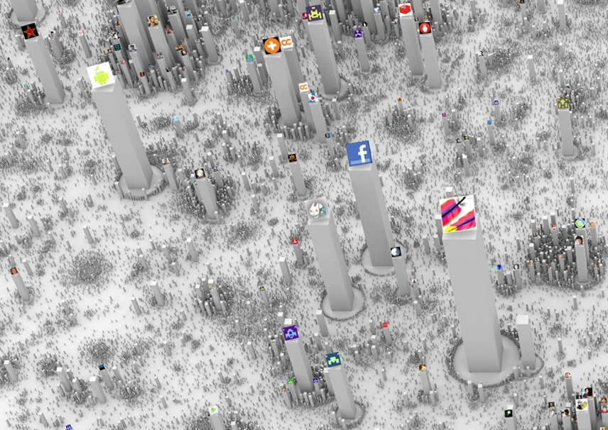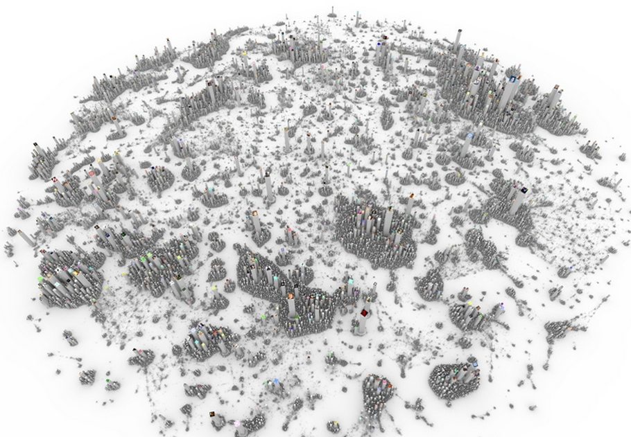 Una visualización creada por Alex Dragulescu en su noble intento de metaforizar las redes sociales en ciudades, en cada una de las redes se puede apreciar pequeños nodos o subciudades o comunas, fenómeno que es más evidenciable en Github que en Stackoverflow, mientras en la primera se nota a simple vista las islas en la ciudad en Stackoverflow todos son más amigos.
